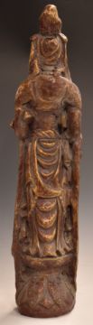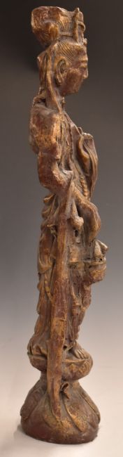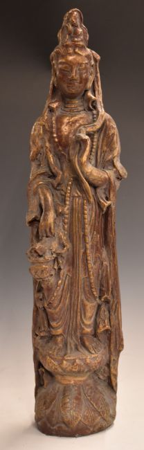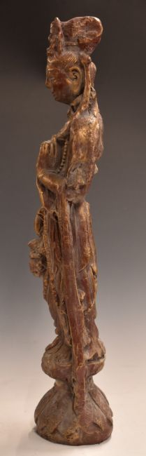 Chinese carved wooden figure of Guanyin with gilt decoration, 64.5cm tall.