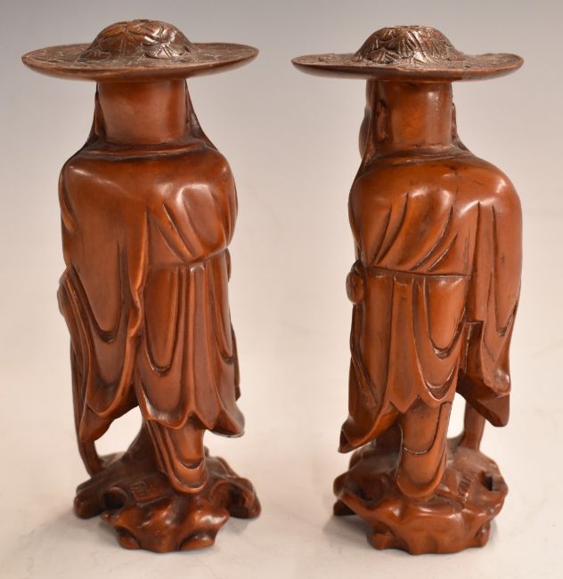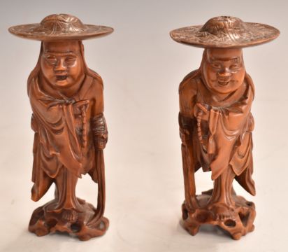 A pair of Chinese carved fruitwood figures of elderly gentlemen wearing hats, 12cm tall.