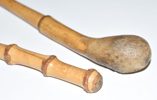 Four swagger sticks including three with bamboo shaft, together with a brass artillery shell, longest 82cm