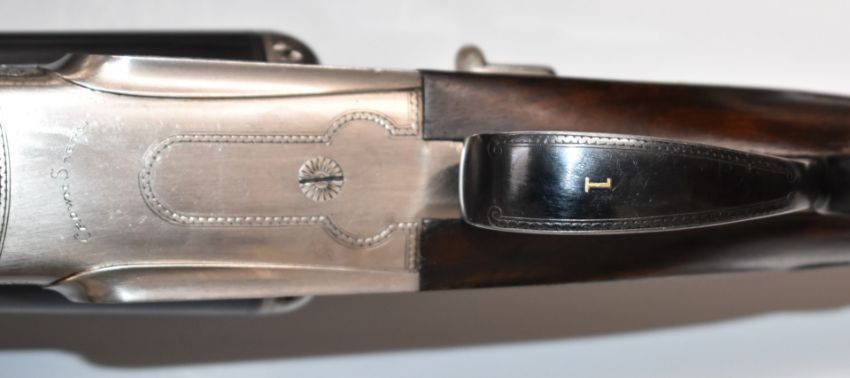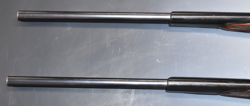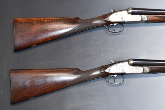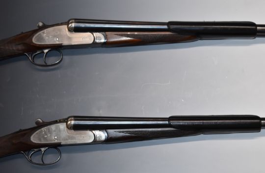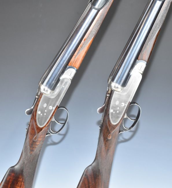 A pair of Arrieta Gunmark Crown Sabel 12 bore sidelock side by side ejector shotguns each with hand detachable locks, border engraved locks, trigger guard, top plate, fences and thumb lever, chequered grip and forend, carved teardrop to the wrist, inset cartouche to the underside of the stock, double trigger, Holland & Holland hand guard and named 27 inch barrels choked improved cylinder and ½, overall length 112cm, length of pull 37cm, serial numbers 32748 and 32749. PLEASE NOTE THAT A VALID RELEVANT FIREARMS/SHOTGUN CERTIFICATE IS REQUIRED TO HANDLE/PURCHASE THIS ITEM.