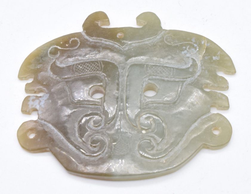 Chinese 19thC archaic jade pendant depicting a stylised Fu dog, 7 x 5.8cm