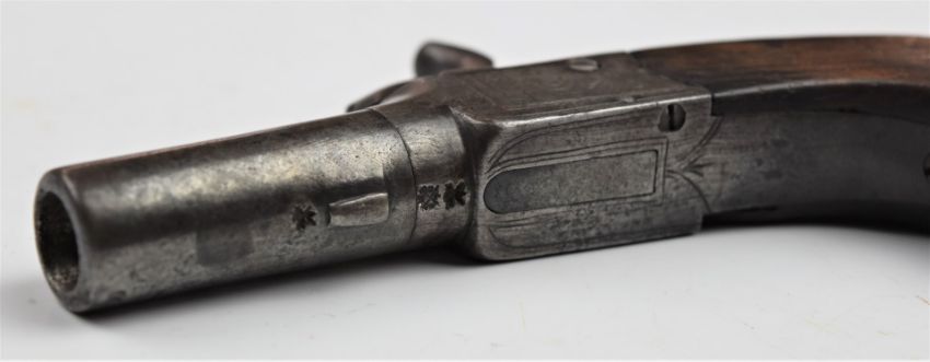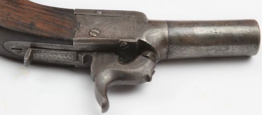 English London made percussion hammer action pocket pistol with engraved lock and hammer, folding trigger, shaped wooden grips, thumb slide safety and 1.25 inch smooth bored turn off barrel, overall length 15cm.