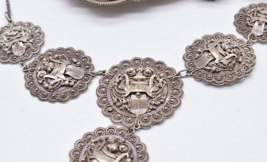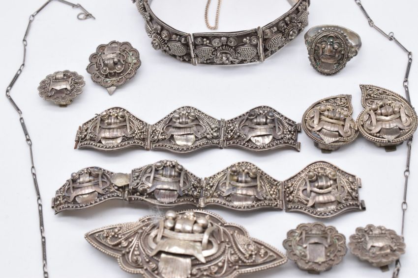 A suite of Chinese white metal filigree jewellery comprising earrings, necklace, brooch and bracelet depicting a stylised Foo dog to each section
