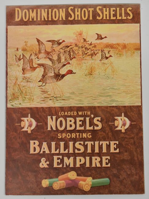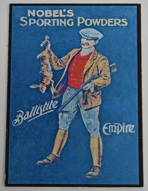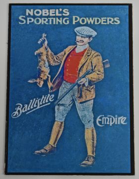 Two modern Nobel's shotgun cartridge shop display or advertising boards 'Dominion Shot Shells Nobel's Sporting Ballistite & Empire' and 'Nobel's Sporting Powders', each 40x29cm.