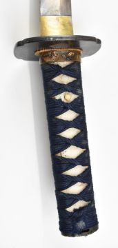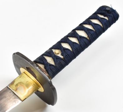 Japanese Wakizashi Samurai sword with shagreen handle, pierced tsuba, ornate fuchi with insect and foliage decoration, embossed gilt kashira and 31cm blade, in lacquer scabbard, overall length 57cm. PLEASE NOTE ALL BLADED ITEMS ARE SUBJECT TO OVER 18 CHECK ON COLLECTION OR DELIVERY