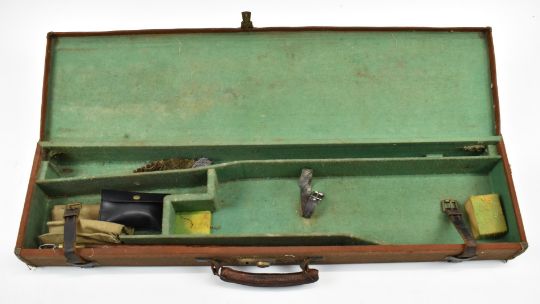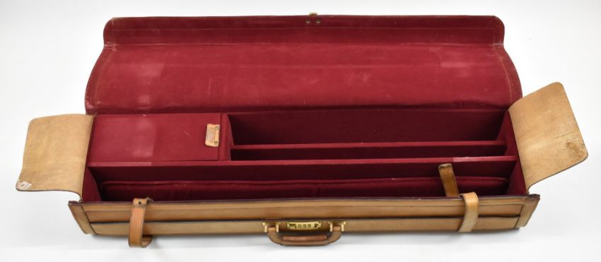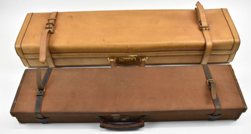 Two shotgun carry cases comprising an Arco leather double motor case with coded lock (86x22x13cm) and a leather and canvas bound example, 77x20x8cm.
