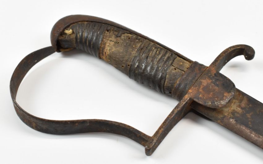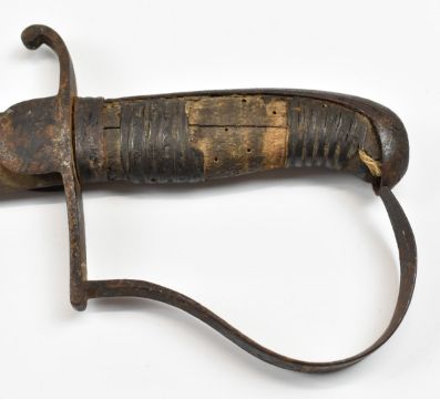 Continental sword with stirrup hilt and 80cm curved blade. PLEASE NOTE ALL BLADED ITEMS ARE SUBJECT TO OVER 18 CHECK ON COLLECTION OR DELIVERY
