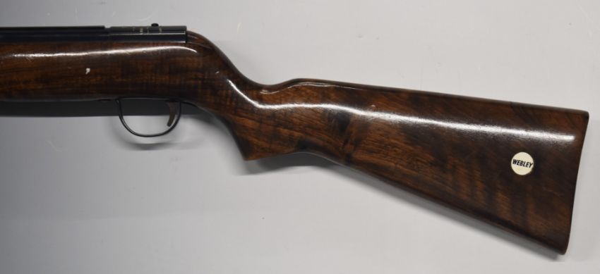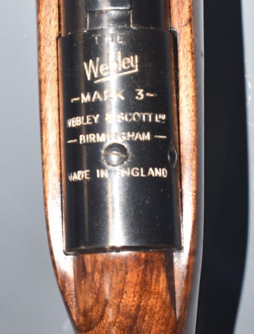 Webley Mark 3 .22 under-lever air rifle with semi-pistol grip, named plaque inset to the stock and adjustable sights, serial number A260.