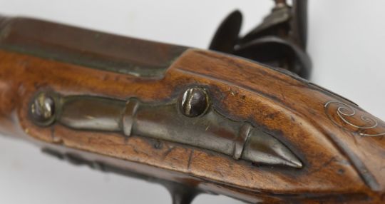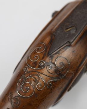 Unnamed flintlock coat pistol with silver wire inlaid grip, metal ram-rod and mounts and 4.25 inch part-octagonal cannon barrel, overall length 23.5cm.