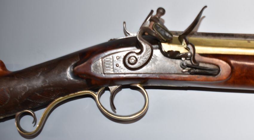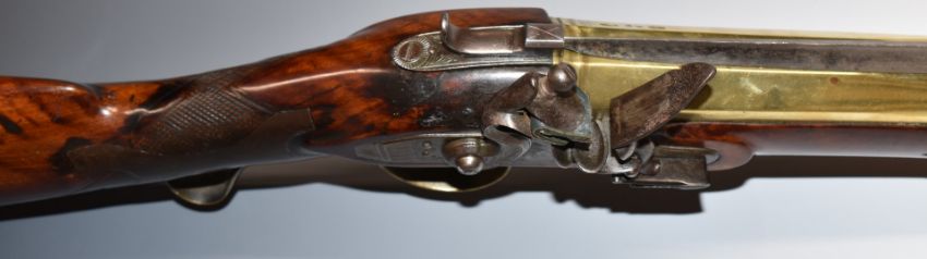 W Kelley of London flintlock blunderbuss with sprung bayonet, engraved steel lock and hammer, engraved brass scrolling trigger guard, butt plate and mounts, chequered grip and named 16 inch part octagonal barrel, overall length 82cm.