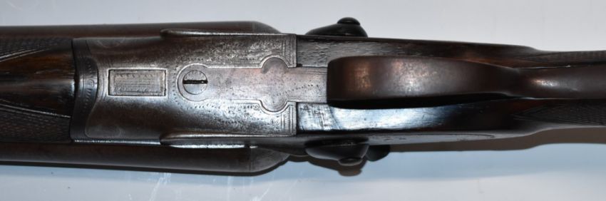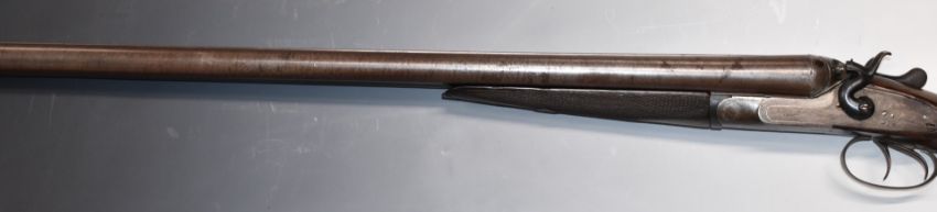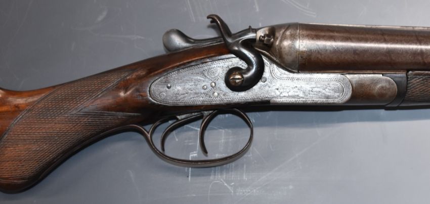 Midland Gun Company 12 bore side by side hammer action shotgun with engraved locks featuring dogs and birds, hammers, trigger guard, underside, thumb lever, fences and top plate, chequered semi-pistol grip and forend, vacant cartouche to the underside of the stock, double trigger and named 30 inch Damascus barrels choked ¾, overall length 118cm, length of pull 36cm, serial number 55026. PLEASE NOTE THAT A VALID RELEVANT FIREARMS/SHOTGUN CERTIFICATE IS REQUIRED TO HANDLE/PURCHASE THIS ITEM.