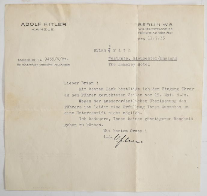 Nazi Third Reich letter dated 11.7.1935 from Berlin on headed paper replying to a request for the autograph of Adolf Hitler, which was declined due to work load