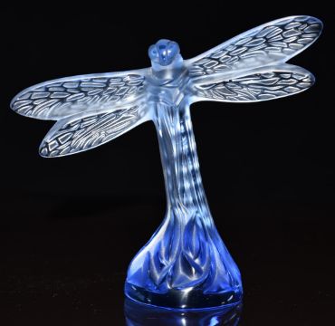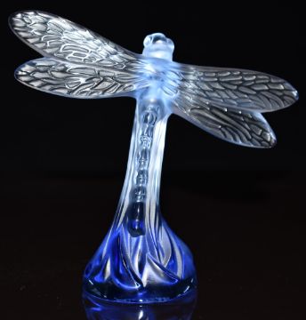 Lalique blue glass dragonfly paperweight, signed to base 'Lalique France', H9cm, in original box, with related paperwork