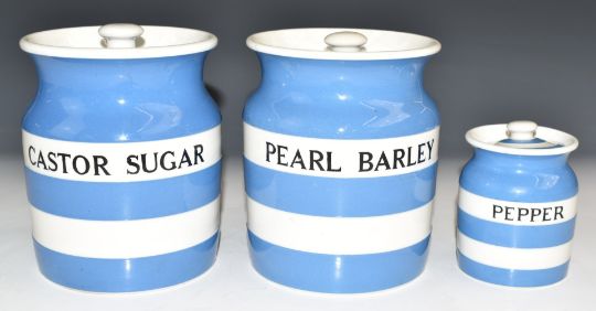 Three TG Green storage jars comprising Pearl Barley, Castor Sugar and Pepper, tallest 14.5cm