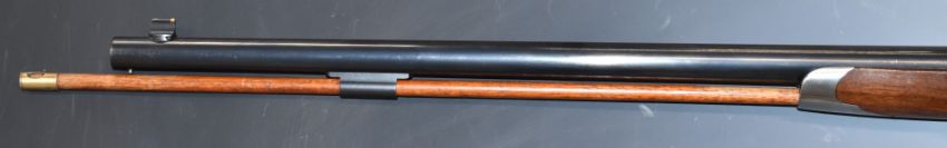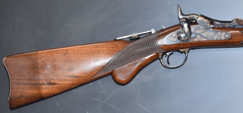 Pedersoli S910 Springfield Officer .45-70 percussion hammer action trapdoor officer's rifle with an eagle and 'US Springfield' engraved to the lock, adjustable trigger, chequered straight hand stock and semi-pistol grip extension, pop-up target sights, brass tipped wooden ram-rod and 26 inch barrel, overall length 114cm, serial number TD1365. PLEASE NOTE THAT A VALID RELEVANT FIREARMS/SHOTGUN CERTIFICATE IS REQUIRED TO HANDLE/PURCHASE THIS ITEM.
