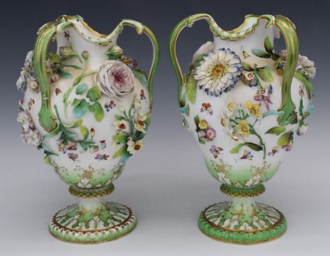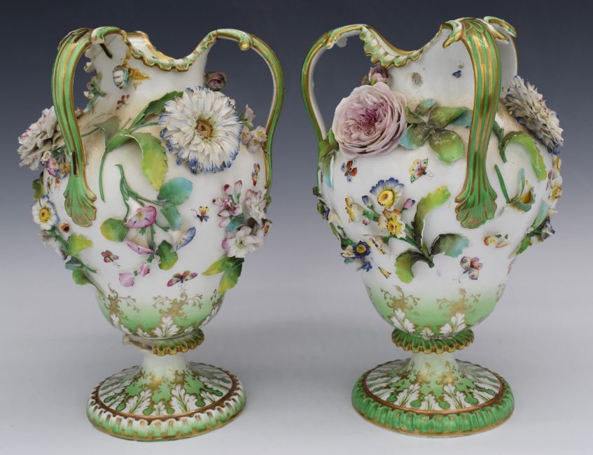 Pair of 19thC Coalbrookdale ewers with applied flower decoration, H32cm
