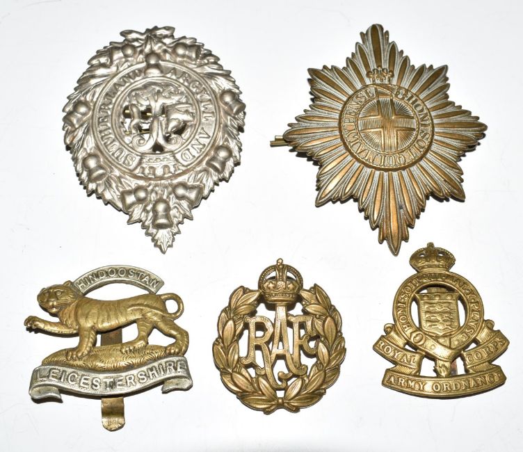 Small collection of metal badges including London Rifle Brigade, Royal Artillery, Scots Guards, Coldstream Guards, 50 VAD Devon, Argyle and Sutherland Highlanders, WW1 commemorative pin badges, Edward VIII Coronation medal etc