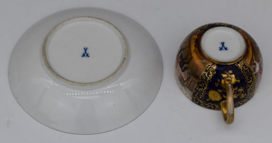 Meissen cabinet cup and saucer decorated with mounted riders, H5.5cm