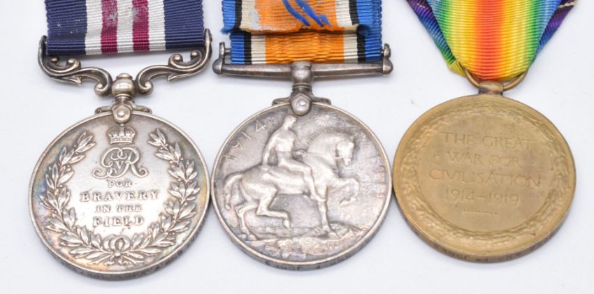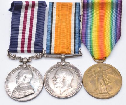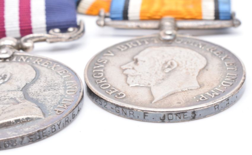 Royal Artillery WW1 Military Medal group of three comprising Military Medal, War Medal and Victory Medal named to 166252 Gunner F Jones, 168/Siege Battery Royal Garrison Artillery (Royal Artillery on War & Victory Medal)
