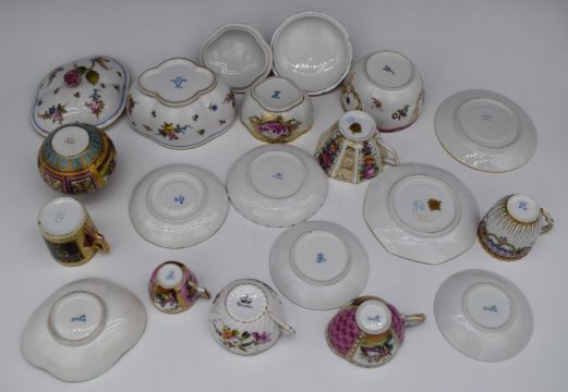 Collection of continental porcelain, Dresden, Meissen, jewelled cabinet cup and saucer with Sevres mark etc, tallest 11cm