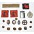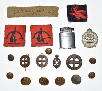 British Army WW2 Women's Transport Service FANY cap and collar badges, buttons and cloth example, together with cloth divisional patches and a Monmouthshire Regiment cap badge