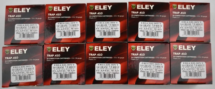 Two-hundred-and-fifty .410 Eley Trap shotgun cartridges, all in original boxes. PLEASE NOTE THAT A VALID RELEVANT FIREARMS/SHOTGUN CERTIFICATE IS REQUIRED TO HANDLE/PURCHASE THIS ITEM. Please note we are not able to post this lot.