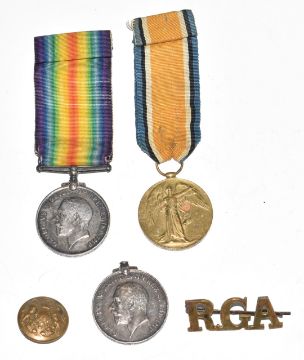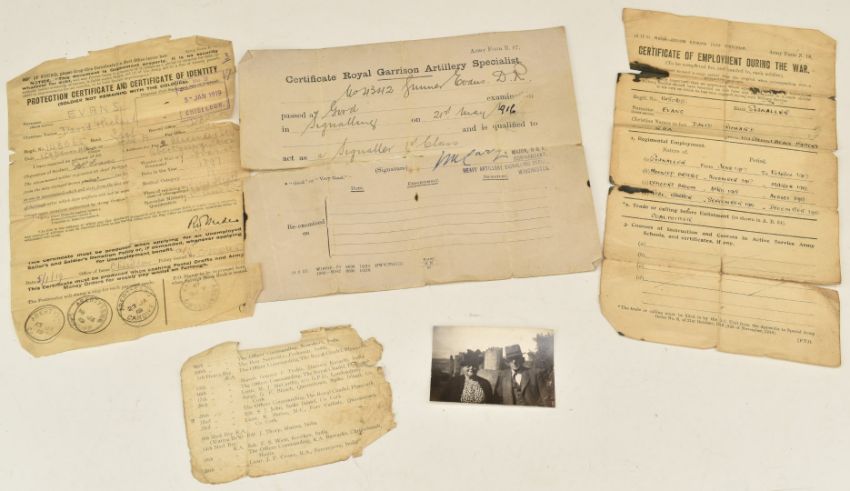 British Army WW1 medal pair comprising War Medal and Victory Medal named to 14805 Gunner DR Evans, Royal Artillery, together with his Certificate of Employment during the war, Royal Garrison Artillery Specialist Certificate, and large framed picture portrait etc, and a further War Medal named to 43476 Driver H Parker, RA