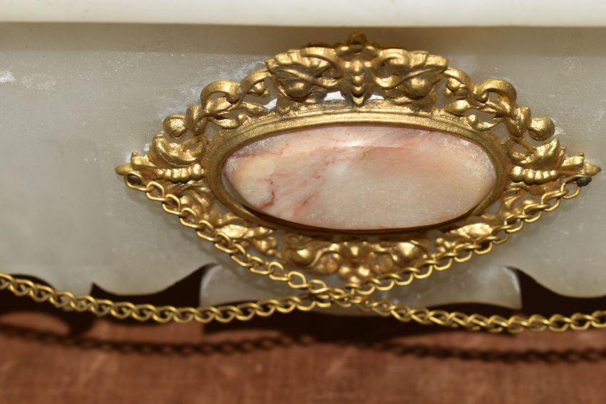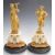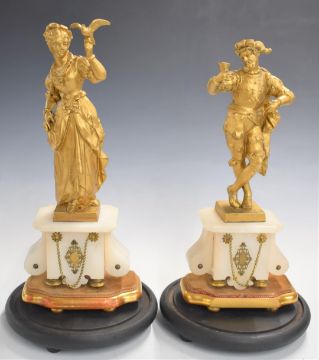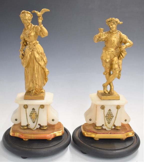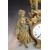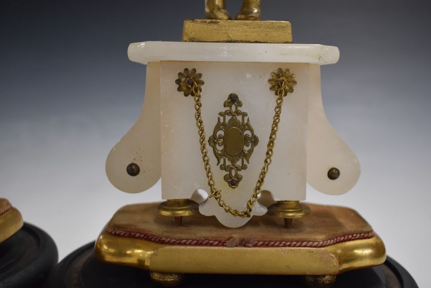 French 19thC figural clock garniture raised on an alabaster base and wooden stand, with single train movement and white enamel dial, W37 x H43cm