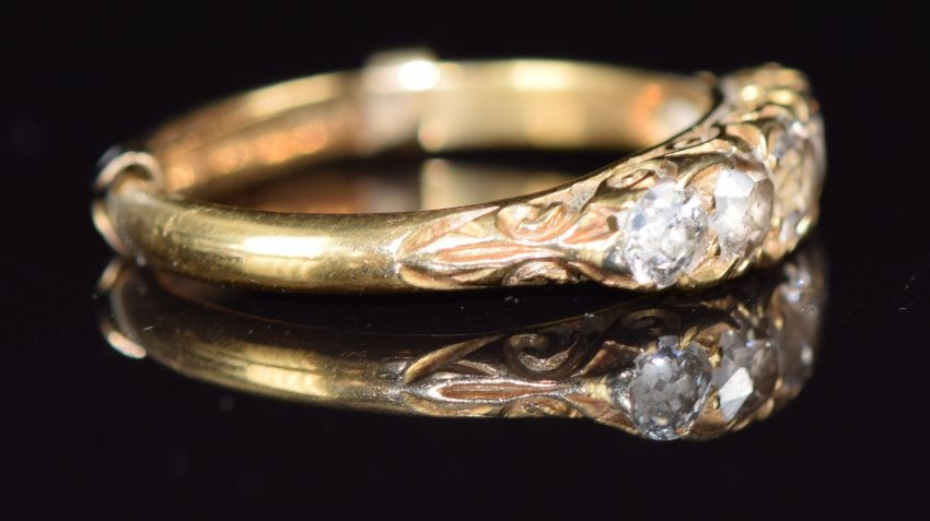 Victorian 18ct gold ring set with five diamonds, the centre diamond approximately 0.3ct, 3.7g, size P