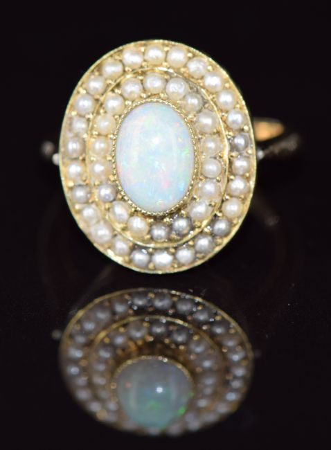 A c1910 9ct gold ring set with an oval opal cabochon surrounded by two rows of seed pearls, 5.8g, size M