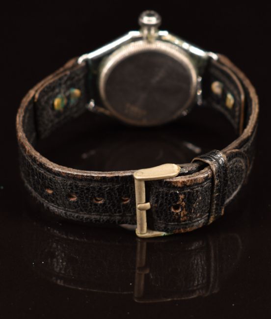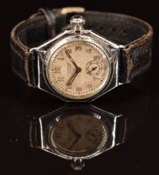 Rolex 'Rolco' Oyster gentleman's wristwatch ref. 2136 with subsidiary seconds dial, luminous hands, Arabic numerals, silver dial, octagonal case and 15 jewel movement, on black leather strap, case diameter 32mm, serial number 71897.