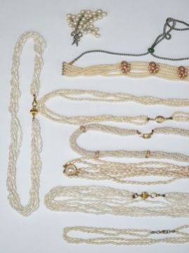 Eight freshwater pearl necklaces and a pearl brooch
