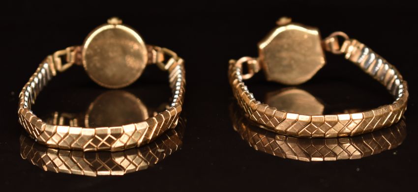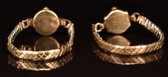 Two Rotary 9ct gold ladies wristwatches, both with subsidiary seconds dials and Arabic numerals, on expanding metal bracelets, largest case diameter 22mm.