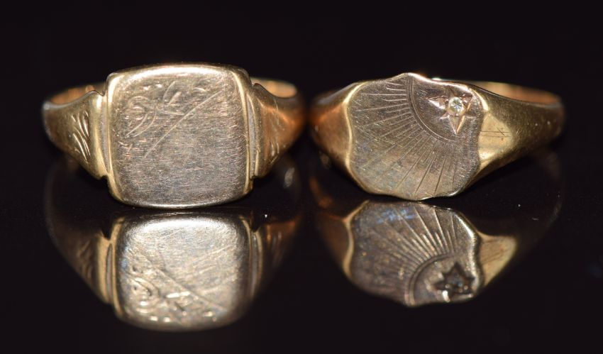 Two 9ct gold signet rings, one set with a diamond in a star setting, 4.8g
