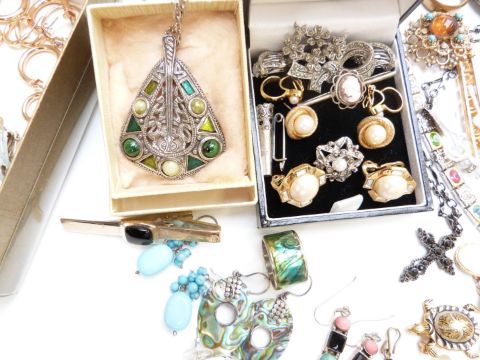 A collection of jewellery including Monet earrings, Miracle pendants, Hollywood necklace and earrings, faux pearls, vintage brooches, watches, etc