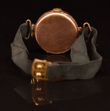 Unnamed 9ct gold ladies wristwatch with blued Breguet hands, black Arabic numerals, silver dial and Swiss movement, on black material strap, case diameter 25mm, serial number 57817.