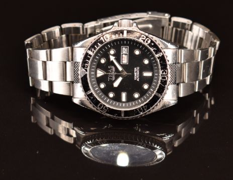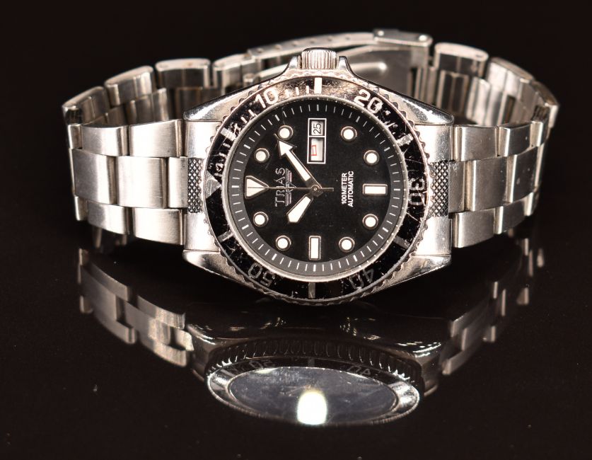 Trias gentleman's automatic diver's style wristwatch with day and date aperture, luminous hands and hour markers, black dial and bezel, stainless steel case, clear exhibition case back and signed movement, on stainless steel bracelet, case diameter 40mm.