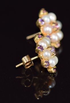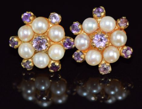 A pair of 9ct gold earrings set with amethysts and pearls, 4.2g, 1.2cm