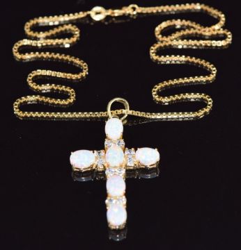 A 14k gold cross set with synthetic opals and cubic zirconia (4.5cm, 6.5g) on 9ct gold chain, 44cm long, 2.4g