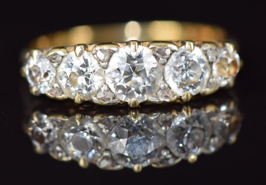 An 18ct gold ring set with five old cut diamonds, the centre diamond approximately 0.5ct and eight further rose cut diamonds, 3.3g, size M