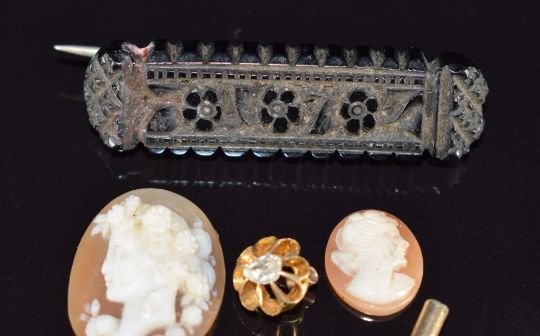 Victorian watch key, carved jet brooch, cameo signed to back, section of gold stick pin set with a pear cut diamond, and a turquoise pendant