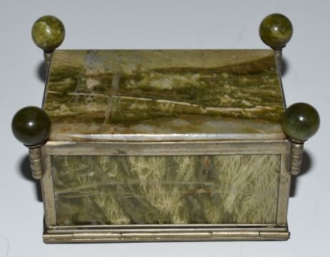 Marble jewellery casket with silver plated mounts and raised on four ball feet, width 9cm