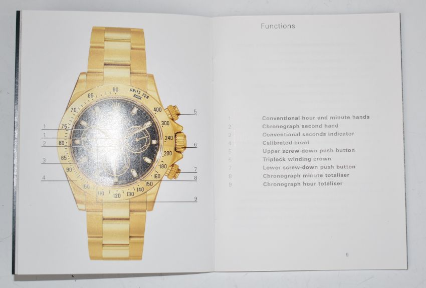Rolex Cosmograph Daytona booklet, a similar Oysterlock Bracelet booklet and a 2000 2001 calendar card.