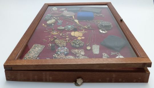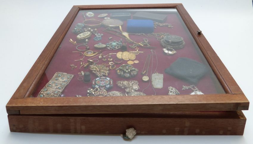 A collection of costume jewellery including filigree, Victorian locket, quartz pendant, micro mosaic brooch, etc in a glass display cabinet