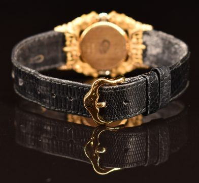 Carrera Y Carrera ladies wristwatch ref. 205 with gold hands and dial, bezel cast in the form of horses and quartz movement, on black leather strap, case diameter 25mm, serial number 1490.