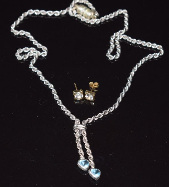 A 9ct white gold necklace set with blue topaz and a pair of 9ct gold earrings set with paste, 4.3g