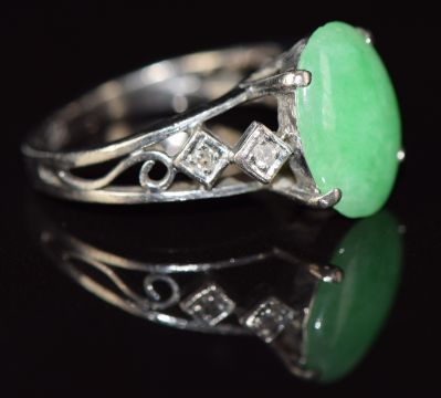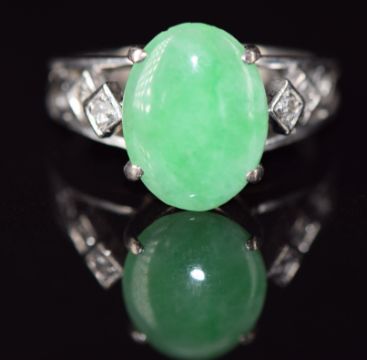 Chinese white gold ring marked 22 set with a jadeite cabochon and diamonds, 3.3g, size H