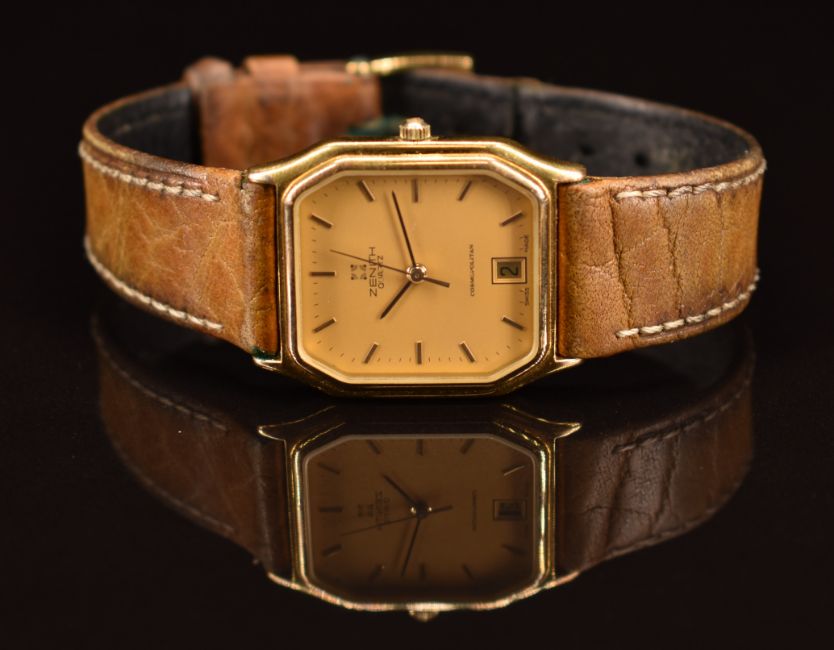Zenith Cosmopolitan wristwatch ref. 27.2870.116 with date aperture, two-tone hands, gold hour markers and dial, gold plated case and quartz movement, on brown leather strap, case diameter 27mm, in original box with guarantee card and related paperwork.