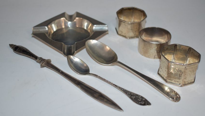 Three various hallmarked silver napkin rings, hallmarked silver ashtray, hallmarked silver teaspoon with shell top, eastern paper knife and a white metal spoon marked Lodigt, weight excluding paper knife weight 185g