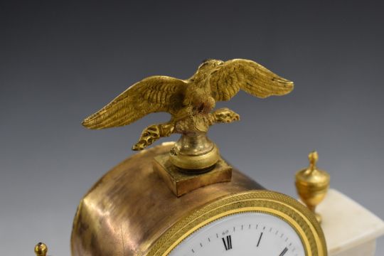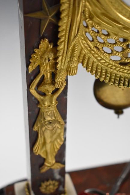 Claude Viet mantel clock, the single train movement signed C. Viet 1718 verso, with white enamel dial, marble columns and visible pendulum, height 39.5cm, under a glass dome, overall height 46cm
